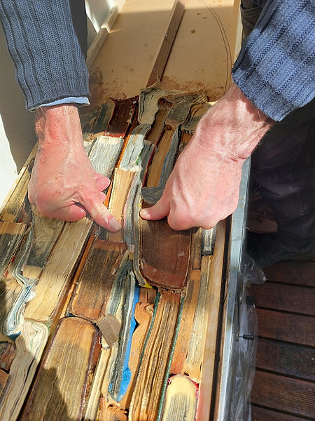 De grote schijf bestaat uit boeken die in repen zijn versneden.